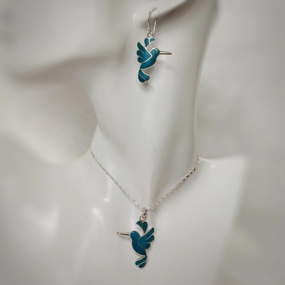 Das Kolibri Chrysokolla Set ist eine wunderschön abgestimmte Schmuckkollektion, inspiriert von der zarten Anmut der Kolibris und der beruhigenden Energie der Chrysokolla. Dieses Set kann Kommunikation, Harmonie und Erneuerung symbolisieren und ist eine bedeutungsvolle Ergänzung für jede Schmucksammlung. Gefertigt, um ein Gefühl von Gelassenheit und Eleganz zu vermitteln, ist es perfekt für diejenigen, die symbolische und naturinspirierte Designs schätzen.