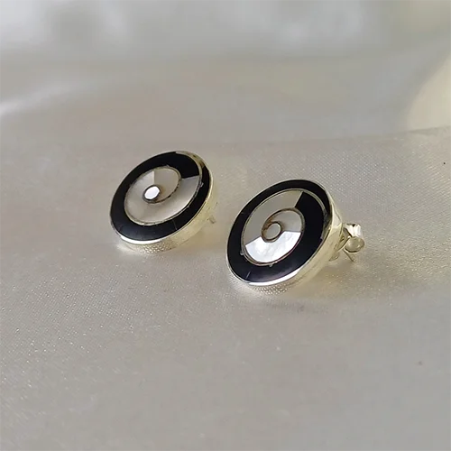 These Spiral Mother Pearl and Onyx stud earrings combine elegant design with meaningful symbolism. The spiral motif can represent growth and transformation, while the mother pearl and onyx elements add a touch of sophistication. Perfect for adding a subtle yet meaningful accent to any outfit.